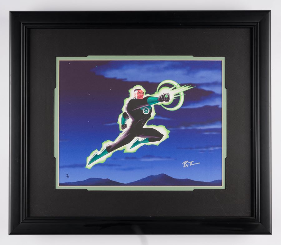A limited edition print based on the Warner Bros. Studios animated series Justice League (2001-2004). Featuring Green Lantern, the giclee on paper print was created in 2003 by the Warner Bros. art program in an edition of only 50 pieces, exclusively for Van Eaton Galleries. The print is titled "Ring of Truth, Ring of Power" and has been hand-signed by artist and series' creator Bruce Timm. Measuring 18"x21" framed, with the mat opening measuring 10"x13", the piece is in very good condition with minimal wear.